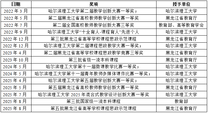 深耕教学工作十余年,始终坚持“立德树人”根本任务,践行为党育人、为国育才教育初心,积极开展教学改革与研究,先后获得第二届全国高校教师教学创新大赛三等奖,黑龙江第二届高校教师教学大赛一等奖,黑龙江省第五届高校教师教学创新大赛一等奖;黑龙江省第二届高等学校课程思政教学大赛三等奖。主讲《机械原理》、《机械设计》、《机械设计基础》、《工程力学》等课程,注重“理论+实践”融合,将真实工程案例、行业前沿技术融入课堂教学。其中主讲课程《机械原理》,2022年入选“第三批黑龙江省高等学校课程思政示范课程”培育项目,2023年被评为“第三批省级一流本科课程”,2025年被评为“第三批国家一流本科课程”。《机械原理》——“机构运动简图的绘制”2023年入选“哈尔滨理工大学课程思政优秀案例”。《机械设计基础课程》于2025年被评“第五批黑龙江省高等学校课程思政示范课程”。先后主持并参加省级教改项目4项,发表教研论文3篇,参编教材一部。获得各类教学比赛奖项十余项。
