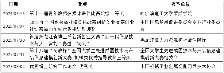 自2015年任教以来,始终致力于切削刀具技术、智能监测技术及房车智能装备等方向的研究与教学,主持国家自然科学基金青年项目、省教育厅2024年度“新时代龙江优秀硕士、博士学位论文”资助项目、校级教改课题各1项,参与国家及省部级科研与教改项目多项。近3年,以第一作者在Journal of Manufacturing Processes、Thin-Walled Structures等SCI TOP期刊及《机械工程学报》等权威刊物发表多篇论文,以第一、第二发明人申请发明专利10余项(授权4项),荣获黑龙江省博士后创新创业大赛铜奖、中国机械工业金属切削刀具技术协会优秀博士研究工作论文优秀奖等科研奖励。