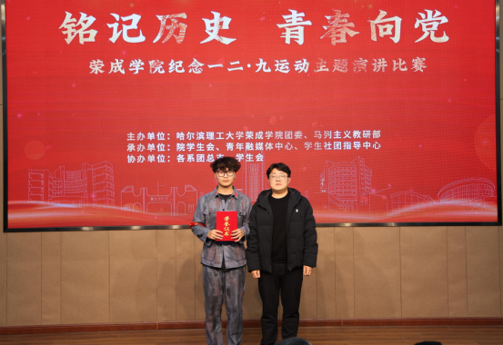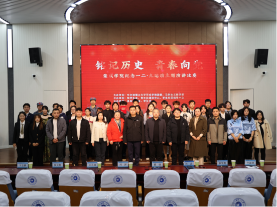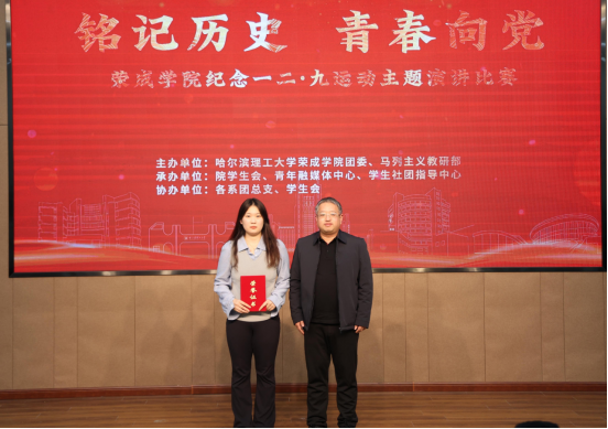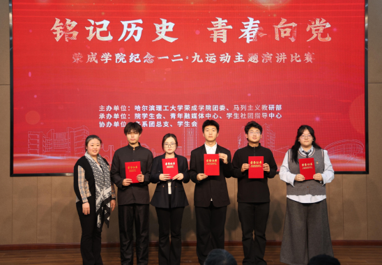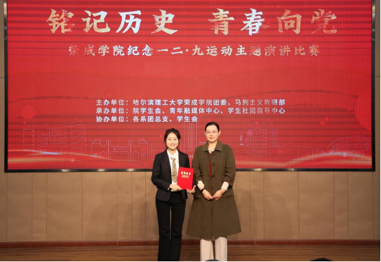 为深入学习贯彻习近平新时代中国特色社会主义思想,纪念“一二·九”运动90周年,引导广大青年学生铭记历史、缅怀先烈、弘扬爱国主义精神,增强历史责任感与使命感,展现学子昂扬向上的精神风貌。12月9日晚,哈尔滨理工大学荣成学院“铭记历史·青春向党”主题演讲比赛决赛在大学生活动中心隆重举行。学院马列教研部主任董晗、学生工作办公室副主任兼团委书记孙晶、外语系副主任许淑珺、建筑工程系副主任刘洋、学院团委老师焦新民、机械工程系辅导员贺成舟、食品工程系辅导员王小旭、软件工程系辅导员侯文轩、经济管理系辅导员卞志鹏出席活动并担任评委。