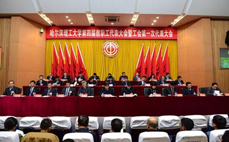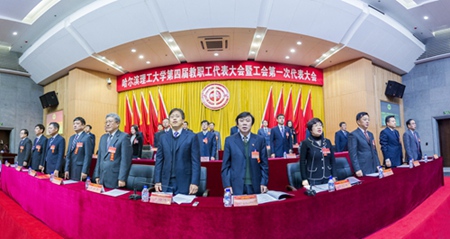 大会在庄严的《国歌》声中进行。陆岩副书记宣布哈尔滨理工大学第四届教职工代表大会暨工会第一次代表大会(下称“双代会”)开幕。