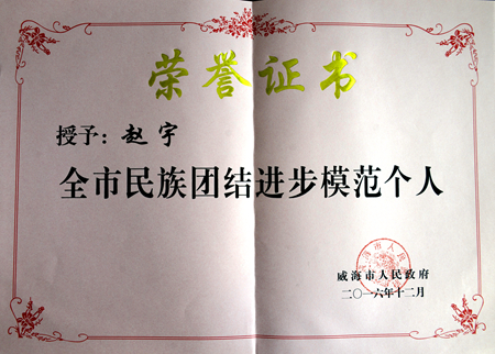 12月28日,在刚刚结束的威海市民族宗教工作会议暨民族团结进步表彰大会上,我院饮食中心副主任赵宇荣获“威海市民族团结进步模范个人”荣誉称号。