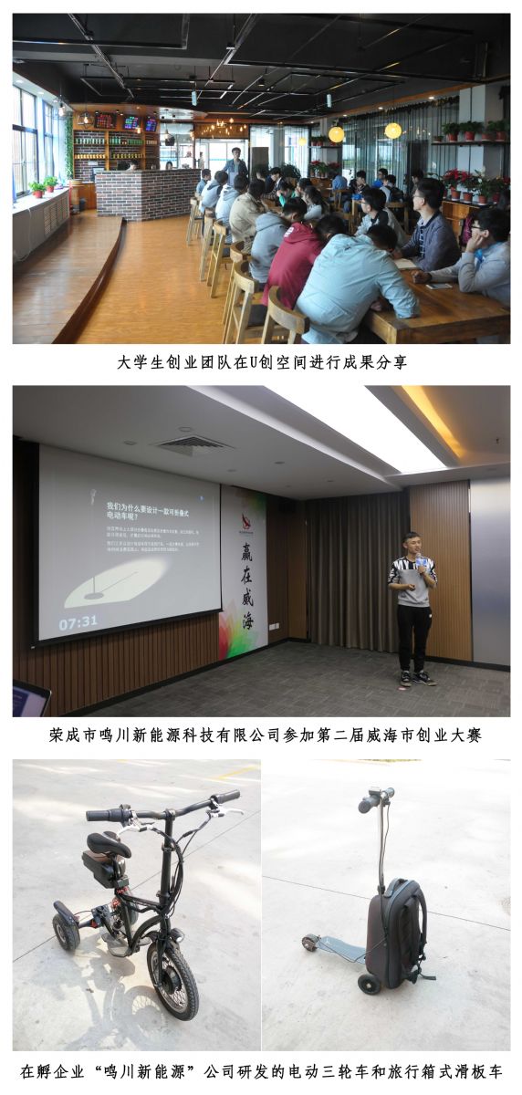 截至目前,创业孵化基地在孵学生创业团队34个,在孵大学生创业企业75家,已毕业大学生创业团队和企业35个,2016年新增注册企业52家,涉及电子商务、文化传媒、科技研发、互联网+等多个领域。其中,由机械系王迪创办的荣成市槽点文化传媒有限公司(公司主营无人机摄影业务),机械系王福星与北理工毕业生赵栋共同创办的荣成市鸣川新能源科技有限公司(公司主营新能源电动折叠车研发)等企业发展势头良好。2016年底,荣成市鸣川新能源科技有限公司入选山东省委统战部和山东省人社厅组织的“泛海扬帆山东大学生创业行动”,获得扶持资金3万元。在双创政策引领、落实和典型的带动下,荣成校区涌现出了一批优秀的大学生创业代表。