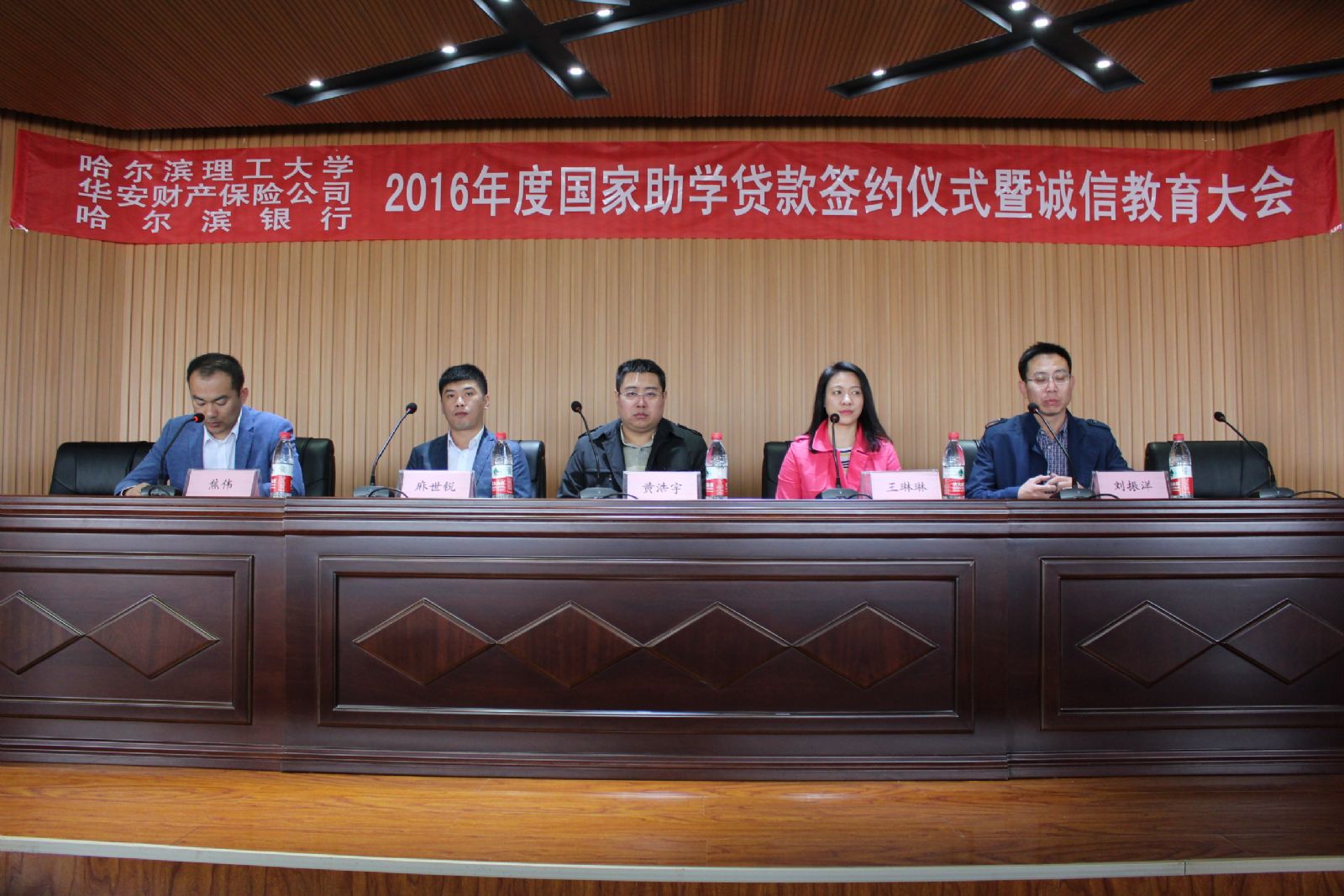 荣成学院于2017年4月13日在图书馆七楼学术报告厅顺利举行了2016年度国家助学贷款签约仪式暨诚信教育大会,华安财产保险股份有限公司黑龙江分公司信用保证险事业部经理王琳琳、华安财产保险股份有限公司黑龙江分公司信用保证险事业部综合管理室主任麻世锐,校学生处刘振洋老师,荣成学院学生工作部部长黄浩宇,相关辅导员老师以及获得2016年国家助学贷款的学生参加了签约仪式。签约仪式由学生工作部副部长焦伟主持。