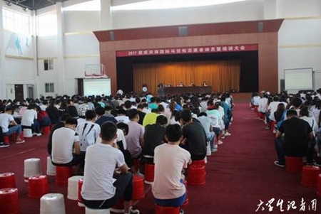 5月21日上午,泰祥·2017荣成滨海国际马拉松志愿者动员暨培训大会在学院文体中心顺利举行。荣成市团市委志愿者负责人李春芬,智美集团赛事总监姜帅,院团委指导教师徐平,院青年志愿者协会主席逄金宇以及来自各系的650余名志愿者参加了本次动员大会及培训。