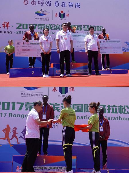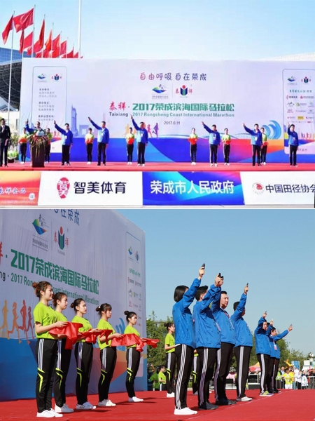 6月11日,泰祥•2017荣成滨海国际马拉松于荣成市体育场燃情开跑。本次赛事由威海市体育局、荣成市人民政府主办,荣成市体育局、智美体育集团承办。来自中国、美国、俄罗斯、英国、肯尼亚、埃塞俄比亚等18个国家和地区的1万余名选手聚首荣成,气势开跑。山东省体育局副局长徐大义,国家体育总局田径管理中心马拉松办公室主任水涛,中共荣成市委书记江山,威海市体育局局长丛华清,中共荣成市委副书记、市长刘昌松,荣成市人民政府副市长王继静,智美体育集团项目事业部总经理程钢,泰祥集团董事长于建洋出席开幕仪式。比赛由CIBN微视听、一直播、梨视频、大众网、威海晚报进行网络现场直播,国内外近50家新闻媒体进行实时跟踪报道。