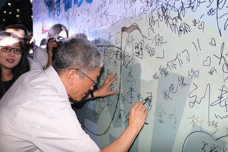 晚会上,特设的走红毯环节吸引了2017届毕业生及在校师生的目光,大家纷纷牵手自己的同学、老师、家人和恋人,一齐走上红毯并在签名墙签下自己的名字。7时40分许,李大勇校长、徐向晨院长与学院领导班子成员步入红毯,李校长在签名墙上写下了对毕业生们衷心的祝福,在与毕业生们亲切合影留念后,领导嘉宾有序步入晚会现场。