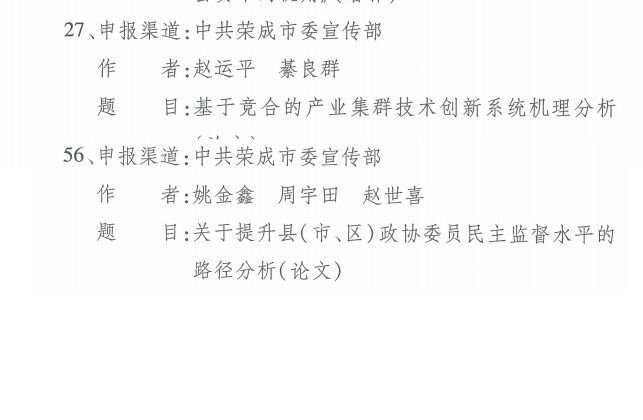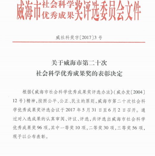 科研产业办公室积极组织学院教师进行申报威海市第二十次社会科学优秀成果奖凭奖,此次评奖共评选出威海市社会科学优秀成果奖96项,其中一等奖10项,二等奖30项,三等奖56项,学院赵运平、姚金鑫老师分别获得二等奖、三等奖。这是学院自参加威海市社科评奖以来获得的第4个和第5个奖项。