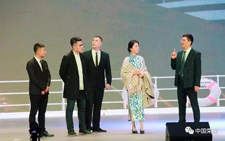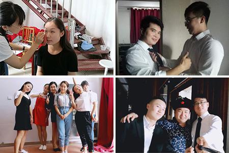 学院四名教师曲彦宇(左一)、徐平(左二)、孙晶(右二)、高飞(右一)分别饰演王淦昌、王夫人、彭桓武及彭夫人