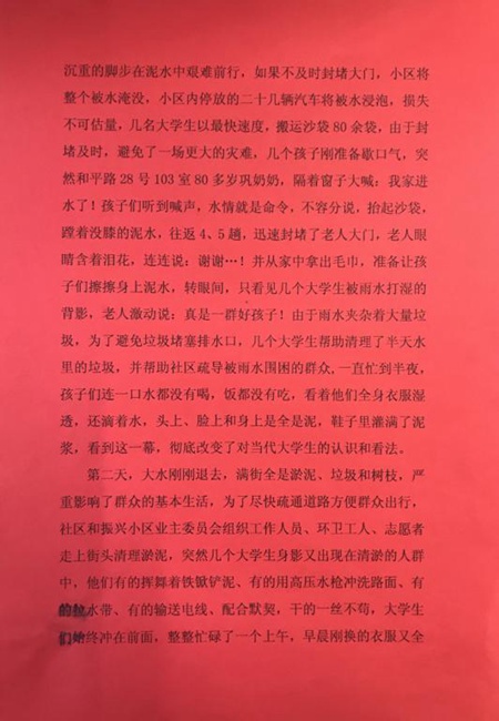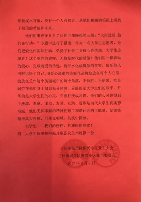 当地居民在来信中表示:面对危险,大学生志愿者始终冲在前面,“奉献、团结、友爱、互助、进步”是他们的真实写照。正是有了这些大学生志愿者,才让自己真正改变了对当代大学生的偏见,看到了祖国的未来和希望。