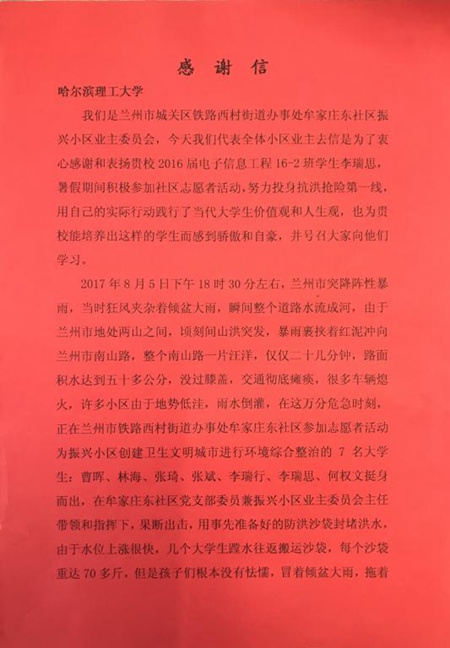 近日,一封来自甘肃省兰州市振兴小区业委会的表扬信被送至我校,讲述了今年八月在当地曾引起轰动的一件感人故事,而故事的主人公就是我校电信16-2班李瑞思同学。今年暑期,兰州市突发暴雨,短时间的大量降水导致城区部分路段出现洪水险情。时值李瑞思同学在社区参与志愿服务活动,面对洪水险情,他和同伴及时伸出援手,协助处置现场情况,并在洪水退去的第二天,又自发帮助社区工作人员和环卫工人清理淤泥污水。今天,笔者得以有幸走近这位勇敢的理工学子。而从他的叙述中,笔者也感受到了当时突如其来的险情和他身上的那股青春担当。为表彰李瑞思同学并引领在校青年学子向其学习,学校授予李瑞思同学“优秀青年志愿者”光荣称号。