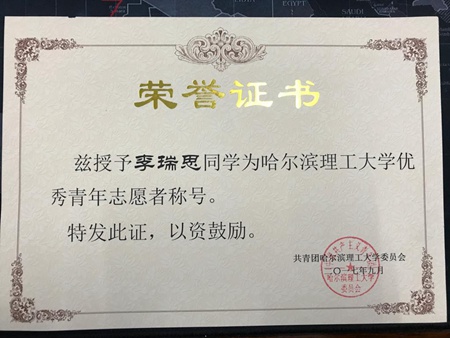 我校授予李瑞思同学优秀青年志愿者称号