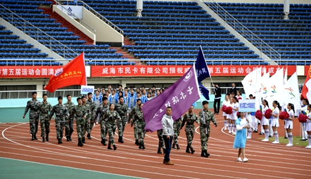 10月12日上午,学院师生前往威海体育场参加威海市第五届运动会(简称“市运会”)开幕式。此次活动是学院积极践行全民健身理念、树立全民健康观念,以良好的精神状态迎接党的“十九大”胜利召开的重要体现。学院副院长张桂华作为活动嘉宾出席开幕式,学院国旗护卫队参加了开幕式方队检阅,部分师生代表学院参加了篮球、羽毛球等比赛项目。
