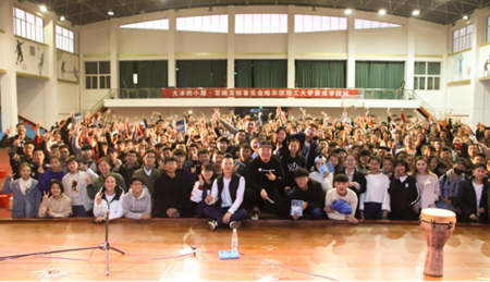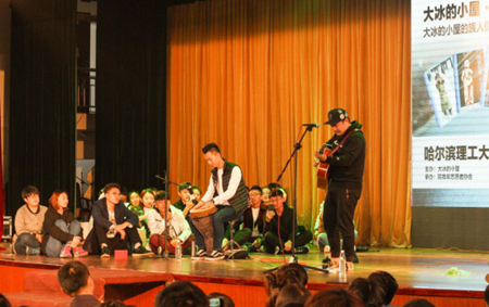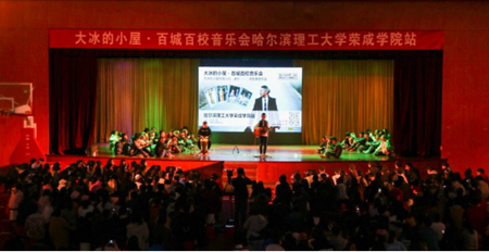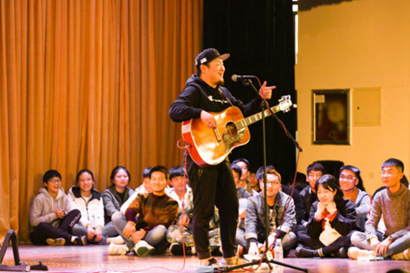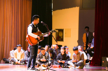 为庆祝党的十九大胜利召开,传播社会正能量,积极广大青年以良好的精神状态投入到中国梦建设中去, 11月5日15时,学院在文体中心举办了的“大冰的小屋·百城百校音乐会”.音乐会现场,小猫王继阳用一把吉他为观众们讲述了大冰团队的励志故事、演绎了动听的民谣,文体中心座无虚席,同学们、老师们纷纷到场,前来享受这一场难得的音乐盛宴。