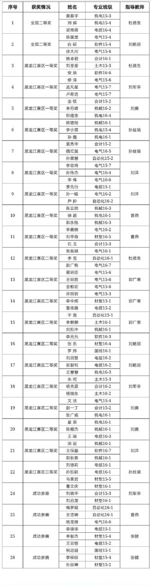 在学校教务处大力支持下,学院基础部每年组织学生参加东北三省数学建模联赛、全国大学生数学建模竞赛和美国大学生数学建模竞赛。围绕数学建模竞赛,数学建模协会还组织了相应的竞赛培训和经验交流讲座,这些活动的开展普及了数学建模的知识、扩大了数学建模的影响、激发了学生利用数学知识解决实际问题的热情,同时也促进了学生创新能力的培养和提高。本次优异成绩离不开指导教师们的悉心指导和严格要求,离不开参赛学生们的辛勤努力。基础部的指导教师们积极组织学生参加各类有利于大学生竞争能力提高的课外科技竞赛,并多次斩获佳绩。期待学院学子利用好数学建模竞赛这一平台,积极参与、锻炼自己、再接再厉,取得新的佳绩!