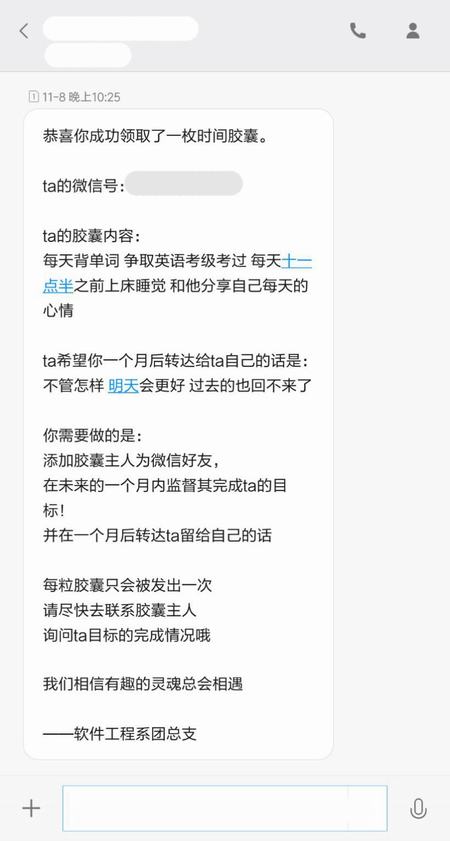 本次时间胶囊活动为期一个月且全部为线上进行,吸引了全院学生积极参与其中,活动报名期间软件工程系微信公众平台就收到近三百份报名表格。活动形式创新,内容新颖,在活动中每个人都可以亲手制作一枚时间胶囊,并在其中写下一个月内可实现的生活小目标、微信号以及想自己说的话。制作好的时间胶囊将会由管理人员随机派发给胶囊监督员,通过微信,胶囊拥有者与监督员开启互帮互助的一个月,在一个月的时间里询问相互的目标完成情况,并给予及时的鼓励和帮助。时间胶囊活动受到了参与者的一致好评,他们表示该活动让校园生活变得更加有趣而丰富,在坚持之后他们也迎来了自己的一次小成功。