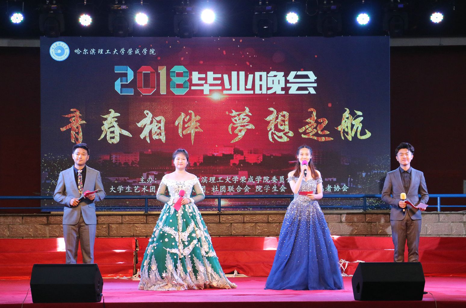 “四年时光飞逝过,一朝欢聚话真情”。6月26日晚,荣成学院“青春相伴,梦想起航”2018届毕业晚会在运动场顺利举行。校党委常委、工会主席兼荣成学院院长徐向晨,荣成学院党委书记刘云峰,学院常务副院长杜野,副院长张桂华,党委副书记兼副院长王坤,学校纪检监察处副处长兼荣成学院纪检监察室主任赵运平,各系部办馆主任,部分教师,全体学生工作人员及毕业生和在校生共同观看了本次晚会。