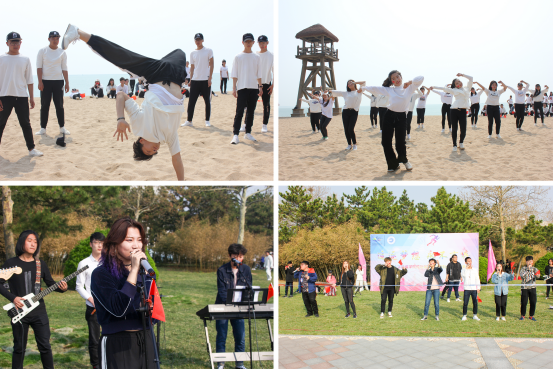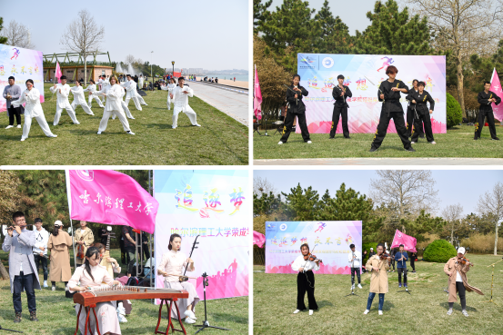此外,学院组织学生参加了团体健康跑。团体赛队伍队服亮丽,步伐整齐,神采奕奕地对外展示着我院学生的良好风貌。由大学生艺术团、民乐团、社团联合会、各系啦啦队伍组成的演出团队,用活力四射、异彩纷呈的表演为选手呐喊打气,为马拉松活动助威添彩。精心准备的23个节目中,民族器乐演奏以浓厚的古风色彩深深地打动了现场观众;太极拳表演吸引了众多市民的驻足观看;乐队和啦啦队的出色表现赢得了观众们的阵阵喝彩,将现场氛围推向高潮。互动演出活动让这场马拉松赛成为城市的节日,用碧海蓝天拥抱“荣马”,用歌声舞蹈迎接宾客,人与环境、人与人之间的和谐场景充分诠释了荣成滨海国际马拉松赛的文化魅力。