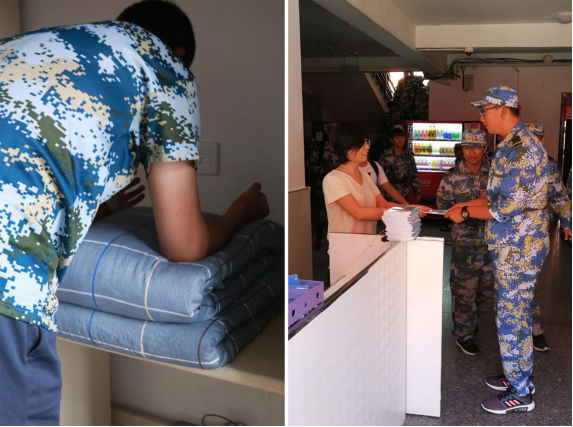 教官指导新生整理内务(左)、宿舍楼长为新生发社区指南(右)