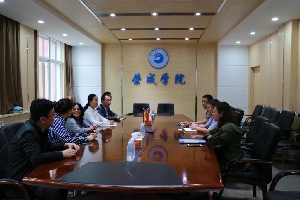 德国格劳豪预科学院院长Bettina Zoelsmann女士对学院的热情接待表示由衷感谢;她对荣成学院办学理念以及办学成就表示赞赏,她指出格劳豪预科学院是国际学生赴开姆尼茨工业大学学习的捷径,学院坐落于德国萨克森州第三大城市茨维考,是该州的工业中心,大众集团培训中心就坐落于格劳豪预科学院3公里处;Bettina Zoelsmann院长此行目的是为荣成学院成绩优秀的学生及教师到格劳豪预科学院进行学习深造提供各种便利条件。
