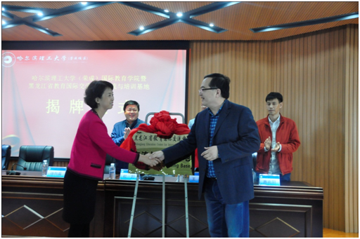 随后,徐向晨院长与吴秀华主任共同为哈尔滨理工大学(荣成)国际教育学院和黑龙江省教育国际交流中心交流与培训基地揭牌,现场掌声雷动,师生共庆。