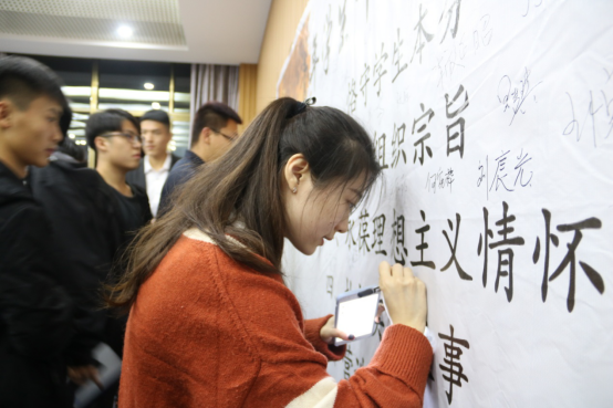随后,孙晶书记从青年学生干部设立的目的和意义、现阶段青年学生干部存在的问题以及对于学院青年学生干部自我定位的建议等四方面一一进行讲解。孙晶老师表明,学生干部首先是学生,其次是干部,设立青年学生干部的目的就是要服务于广大同学,服务于学校,肩负起加强校园精神文明建设的重任。在学生干部设立的意义上,孙晶老师认为,对高校而言,学生干部一是学校领导和学校老师的得力助手,二是是沟通学生和教师的桥梁。学生干部具有双重身份,既是受教育、受管理者,又是教育管理的实施者。他们会在自己的能力范围内去帮助老师们分忧解难,把学校的有关规定、精神及时贯彻到学生中去,而同时也积极向学校反映广大学生的建议和对学院建设的宝贵意见。针对学生干部普遍存在的利己主义、官僚主义、庸俗主义、学习工作失衡等突出问题,孙晶老师提出四点建议:“思想上要立志,立鸿鹄志,做奋斗者”;行为上应严以律己,宽以待人,杜绝官僚主义在学生组织中滋生;工作上应坚持理想与实际相结合;平衡学习与工作关系,规范自己的大学生活。最后,学生干部在青年学生干部自律公约倡议签名板上一一签字。