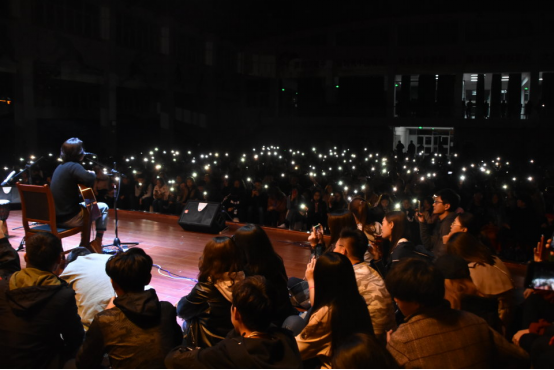 每一首歌都藏着歌手背后的故事,他们不单单只是一把吉他,一段路、几首歌,更是在追梦路途上的种种刻骨的故事,《陌生女人的告别》藏着一段凄美的爱情故事,《菩提》蕴含着他们饱经风霜也从未割舍的情怀、《岁月》更是在歌手们在大学时写下的不舍的故事,提到那段青葱的年华,两位歌手依然感受颇多,他们表示:大学是人生最美好的一段时光,希望同学们能够好好珍惜,在人生最美好的年华做自己想做,爱自己所爱,在未来才能不留遗憾。结尾处两人忘我的合唱《陪我到可可西里去看海》,虽然现场学生们未尝见过歌曲中描述的那片海,但却早已在心里勾勒出一片自由神往的海洋,大家不由自主拿起手机打开灯光,随着悠悠的音乐,合出自己内心的旋律。至此,历时两个小时的音乐会落下帷幕,许多观众意犹未尽,仿佛仍沉浸在会场的民谣中。