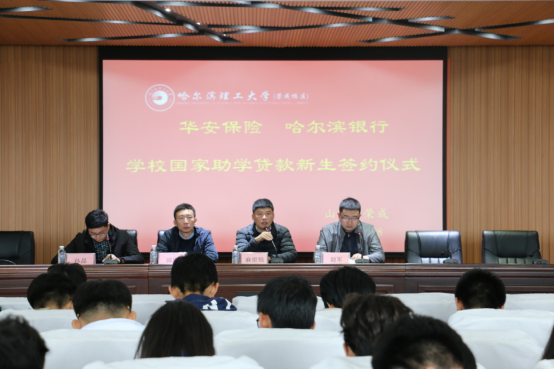 荣成学院于2018年11月8日在图书馆七楼学术报告厅顺利举行了2018年度国家助学贷款签约仪式暨诚信教育大会,华安财产保险股份有限公司黑龙江分公司信用保证险事业部综合管理室主任麻世锐,校学生处田家老师,荣成学院学生工作办公室主任赵军,相关辅导员老师以及获得2018年国家助学贷款的学生参加了签约仪式。签约仪式由学生工作办公室副主任孙晶主持。