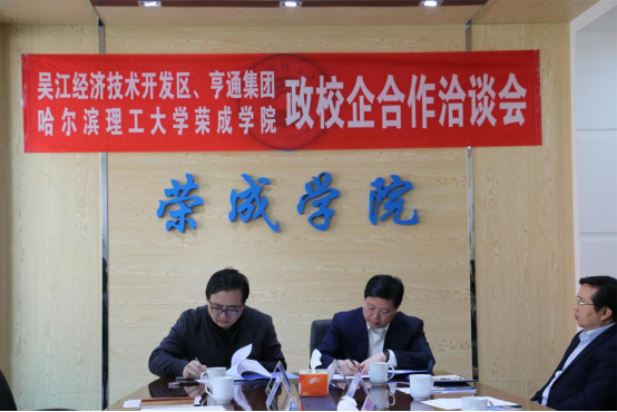 会议最后,徐向晨院长与杨骏总监共同签署了荣成学院与亨通集团《校企合作框架协议》。亨通集团是是服务于光纤光网、电力电网、金融和大数据互联网、文旅地产等领域的国家创新型企业,连续多年来学院招聘毕业生,深受学生喜欢,现已有近200名毕业生签约亨通集团。此次合作协议的签署,对于促进学院教育教学发展,提升人才培养质量,推动毕业生高质量就业具有重大意义。在协议精神指导下,双方将在基地建设、在校学生联合培养、在职教师培养支持、在职员工联合培养、优先安排就业等方面进一步开展深入合作。