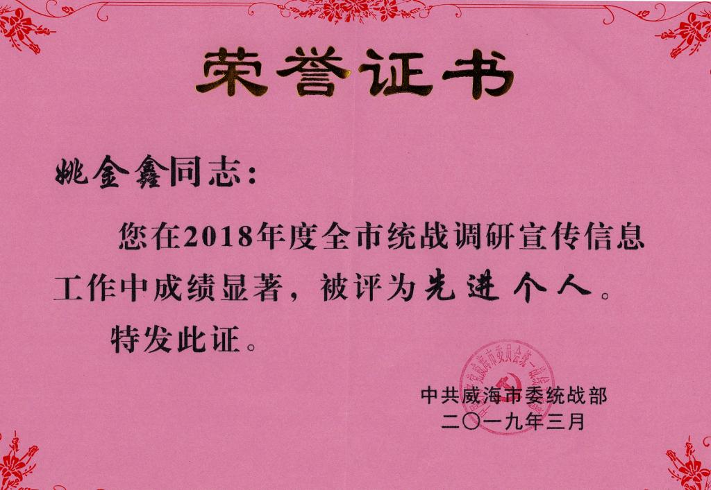 近日,中共威海市委统战部对2018年度威海市统战调研宣传信息工作先进集体和先进个人予以通报表彰,姚金鑫同志荣获先进个人称号。