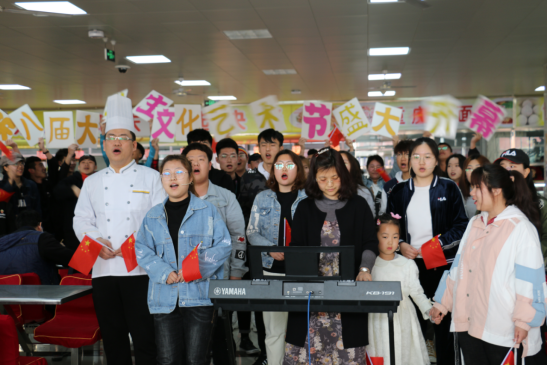 中午时分,学院二食堂像往常一样人来人往,一段悠扬的前奏响起,现场的喧嚣戛然而止,一位身穿白色礼裙的可爱小女孩唱起爱国歌曲《我和我的祖国》随电梯缓缓走下。一旁,交错的黑白键弹奏出各种不同的音律,周围的师生慢慢聚拢,一起扬起手中的国旗,放声歌唱,现场观众也被活动的浓厚氛围感染,从四面八方汇聚到演唱队伍中来,令人心潮澎湃。鲜艳的旗帜在手中挥舞,熟悉的旋律在耳畔响起,高潮迭起的乐曲,唱出了师生对祖国的美好祝愿,满怀激情的表演,传递着学子对母校的无限热爱。最后,快闪活动在“第八届大学生校园文化艺术节盛大开幕”的呼号声中圆满结束。