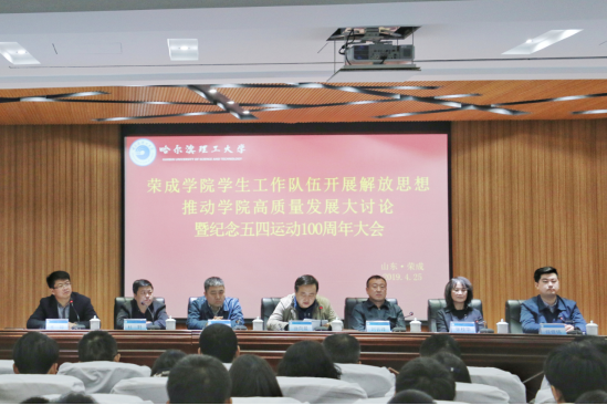 4月25日下午,荣成学院在图书馆报告厅举行学生工作队伍开展解放思想推动学院高质量发展大讨论暨纪念五四运动100周年大会。学校党委常委、工会主席兼荣成学院院长徐向晨,校学生处处长杨忠学,学院党委书记刘云峰,常务副院长杜野,副院长张桂华,全国高校辅导员年度人物、校少数民族学生专职辅导员任佳伟出席大会。学院相关职能部门负责人,各教学单位负责人,各教研室主任,全体学生工作人员,全体班主任和部分学生干部代表共计200余人参加大会。会议由院党委副书记兼副院长王坤主持。