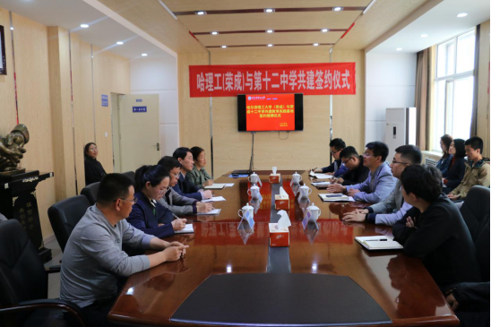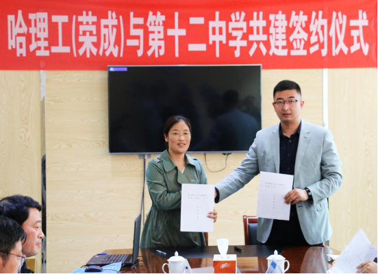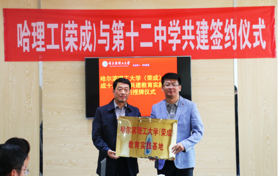 随后,王坤副书记代表学院为教育实践基地学校授牌。赵军主任作为院方代表与第十二中学刘昌军副校长签订了共建协议。