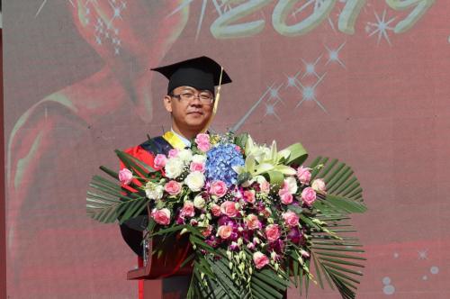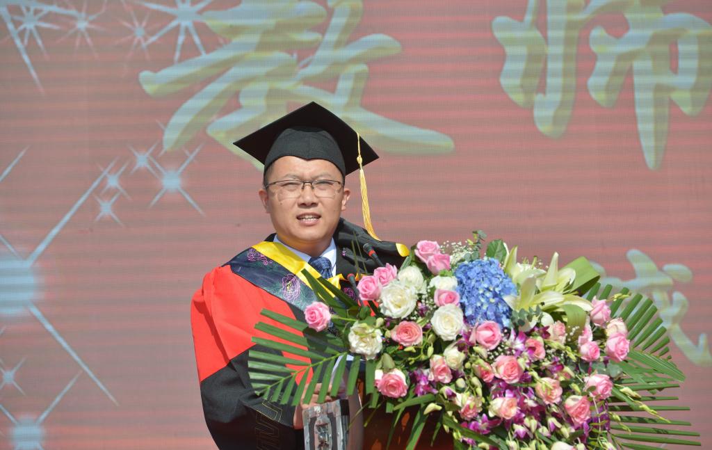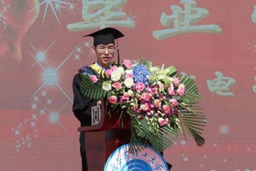 学校校长、学位评定委员会主任委员赵琳在典礼上发表讲话,向学院完成学业的毕业生表示热烈的祝贺,向各位毕业生父母和老师表示了由衷的谢意。赵校长细数了大学四年生活的点滴:占座、熬夜、看球、追剧;欢笑、郁闷、感动、疯狂;同窗之谊、师生之情、恋人之爱……这些如珍珠般镶嵌在青春记忆里的印迹都是人生宝贵的经历,希望毕业生们把收获的一切好好珍藏。赵校长在发言中指出,毕业不是结束,而是开始和进步;毕业典礼不是欢呼“结束”和宣布“完成”,而是庆祝开始和纪念进步。离歌唱罢,拨穗礼成,今后的人生路上,会有鲜花和掌声,也会有曲折和落寞。无论身在何方、身处何境,都要经得起“酸”的考验、挡得住“甜”的诱惑、耐得住“苦”的磨练、担得起“辣”的责任、受得了“咸”的汗水,练就五味俱全的体魄,绘就五彩缤纷的人生。最后,赵校长嘱托毕业生三句话:一是做一个有初心的人。当囿于泥潭时,抬头仰望星空,不坠青云之志;当迷于诱惑时,俯首叩问初心,谨守君子之德。二是做一个有格局的人。不为一纸文凭而读书,不为一己私利而追求,找到属于自己的人生坐标,把个人命运放到民族与世界发展的大坐标中,在历史的接力赛中,跑出最精彩的一棒。三是做一个有信仰的人。放眼天下,胸怀古今,有勇有力而不粗俗蛮横,有智有谋又能博采众长。居庙堂之高,不改凡人底色;处江湖之远,要有将相襟怀。最后他希望毕业生在这一人生重要转折点,能够秉承“知行统一、博厚悠远”的理工校训,带着母校的希冀,一路高歌前行,不忘初心再出发,牢记使命勇担当。戴上指环,做母校永远的MVP!