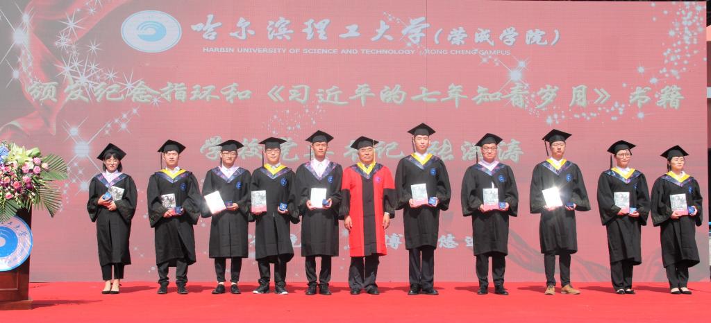 学校党委书记张洪涛为应征入伍大学毕业生、志愿服务基层毕业生和优秀毕业生代表颁发外侧刻有“哈尔滨理工大学校徽”,内侧镌刻每一位毕业生学号、“寓意为同学们与母校缘定今生;告诫毕业生心中有戒、眼中有光!”的专属毕业纪念指环和《习近平的七年知青岁月》书籍。