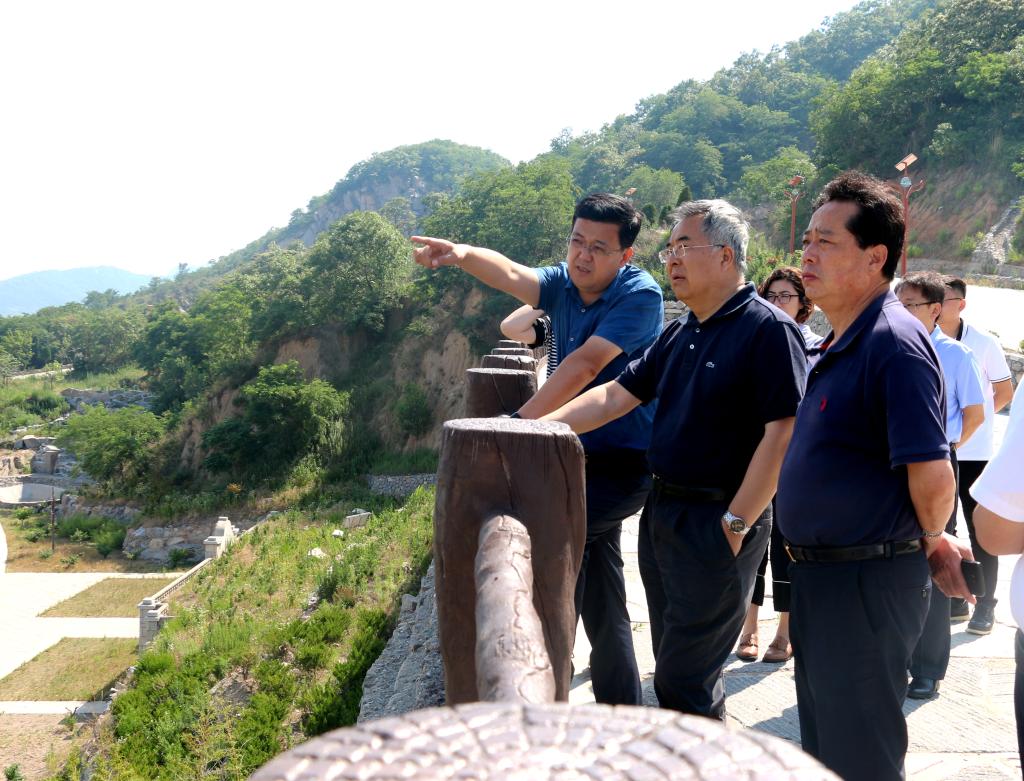 宁津街道党委书记战军刚在甲子山上向张洪涛书记汇报学院与宁津合作项目