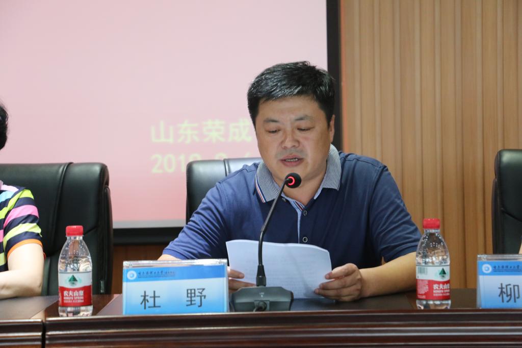 杜野代表荣成学院致辞,他说,哈尔滨理工大学工程硕士研究生将教学点设在荣成学院,面向荣成招收工程管理硕士研究生,是荣成学院一直以来坚持服务地方理念的有效实践,是为地方社会经济发展提供人力资源保障的重要途径,是把荣成学院的发展融入地方的有益尝试,同时,也是荣成学院提升内涵建设,提升办学层次,促进学院发展的重要举措。2018年首次招生34人,2019年招生56人,荣成学院将全力调动教学资源和有关教职员工的积极性,为广大同学的学习和生活提供高质高效服务。