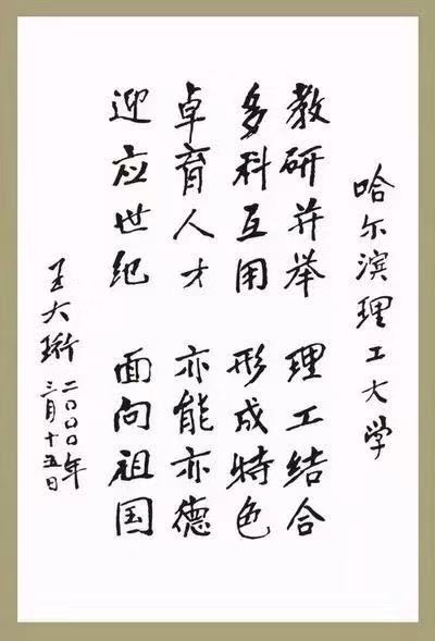 2000年9月,85岁高龄的老校长重返哈尔滨理工大学参加50周年校庆活动,为学校题写了“教研并举,理工结合;多科互用,形成特色;卓育人才,亦能亦德;迎应世纪,面向祖国。”这是他多年教育与科技实践形成的教育思想的结晶,也是新时期指导学校持续健康发展的办学思想。