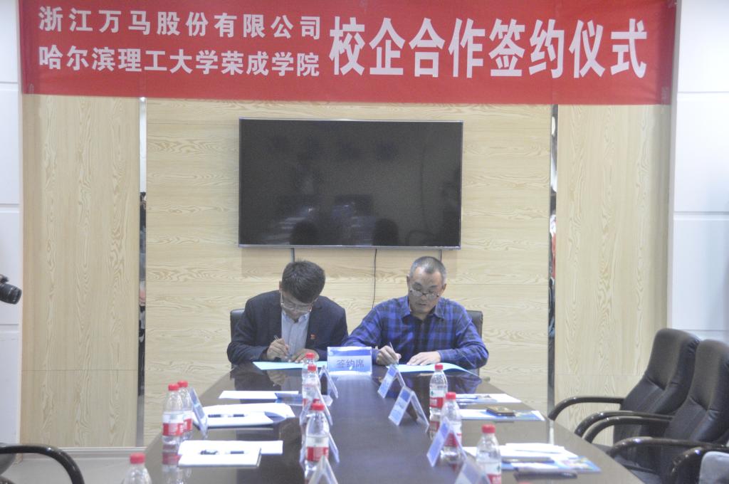 最后,在双方领导共同见证下,王坤副书记与刘焕新副总经理签署了《哈尔滨理工大学荣成学院与浙江万马有限公司校企合作协议书》。此次校企合作不仅推动了高素质技能型人才的培养,提高了人才培养的力度,而且达到了产学研教的深度融合,形成了互利双赢、协同创新的育人新格局。