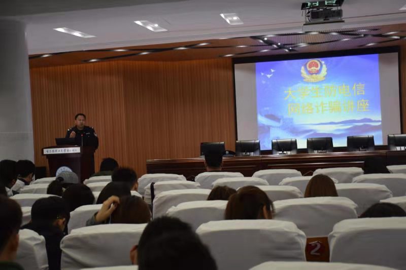 讲座会上,杨建锋所长首先就网络电信诈骗案件发展现状、校内常见网络电信诈骗手段、大学生如何防范网络电信诈骗等方面进行了概括讲解。李峰警官结合专业反诈骗知识、经验以及近几年学院发生的典型真实诈骗案例,详细讲解了网络电信诈骗的作案形式、手段、正确的处理方式以及防范措施。