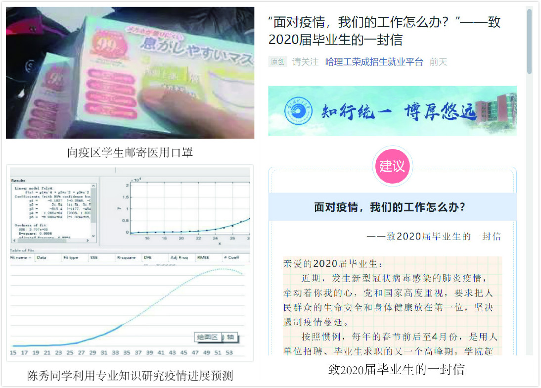 学院转发《教育部致全国大学生一封信》、《哈尔滨理工大学致学生家长们的一封信》等疫情防控工作要求,并且通过微信,QQ群、网站等渠道推送涵盖“新冠”科普、防护措施、校院通知、工作动态以及先进事迹等文章24篇,推送自制抖音短视频2部,制作MV短片《抗击“新冠”》一部,“学习强国”推荐了学院学生文艺原创《入耳入心的防“疫”disco》。教育学生及家长科学理性认识疫情,引导学生服从疫情管控大局,服从学校日程管理安排,倡导合理安排学业规划,鼓励爱心捐赠、志愿服务等防控疫情工作,550余名学生主动通过武汉慈善总会、龙江天使医疗救助基金会、韩红爱心慈善基金会等捐赠渠道,截至2月6日累计捐款6.6万余万元,捐赠口罩近1000个。许多学生参加居民社区,村庄当地防疫的志愿服务队伍中,助力各地疫情防控工作。