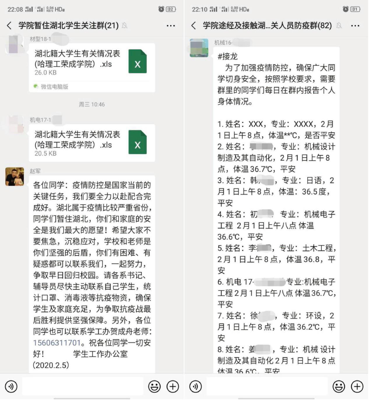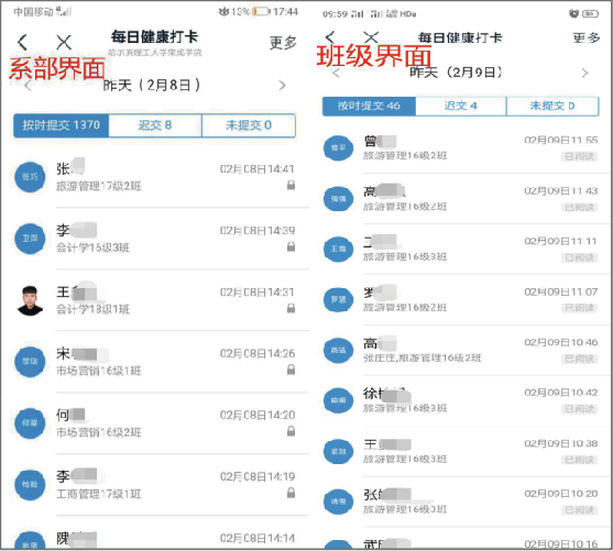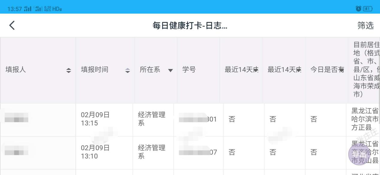 学院全体辅导员利用软件平台建立了全体在校生金字塔式平台架构,完成了学生信息数据纠偏,汇总统计筛选提存等细致繁重工作,全体学生实行“每日健康打卡”工作制度。学生通过“每日健康打卡”活动,学工办、系书记、辅导员、班级干部分层分级,通过平台对学生身体健康状况、体温、行动轨迹等进行动态跟踪掌握,特别是对居住在疫情中心湖北省、有过湖北逗留经历、身体发烧咳嗽等异常情况实行每日联络动态跟踪,将毎日变化纳入报告内容和管理服务内容。随着疫情的变化,截止到2月17日共有181名学生汇报所住小区、村屯现居住所发生确诊或疑似病例,力求做到学生疫情防控工作底数清楚,为疫情防控和下一步开学工作奠定数据工作基础。