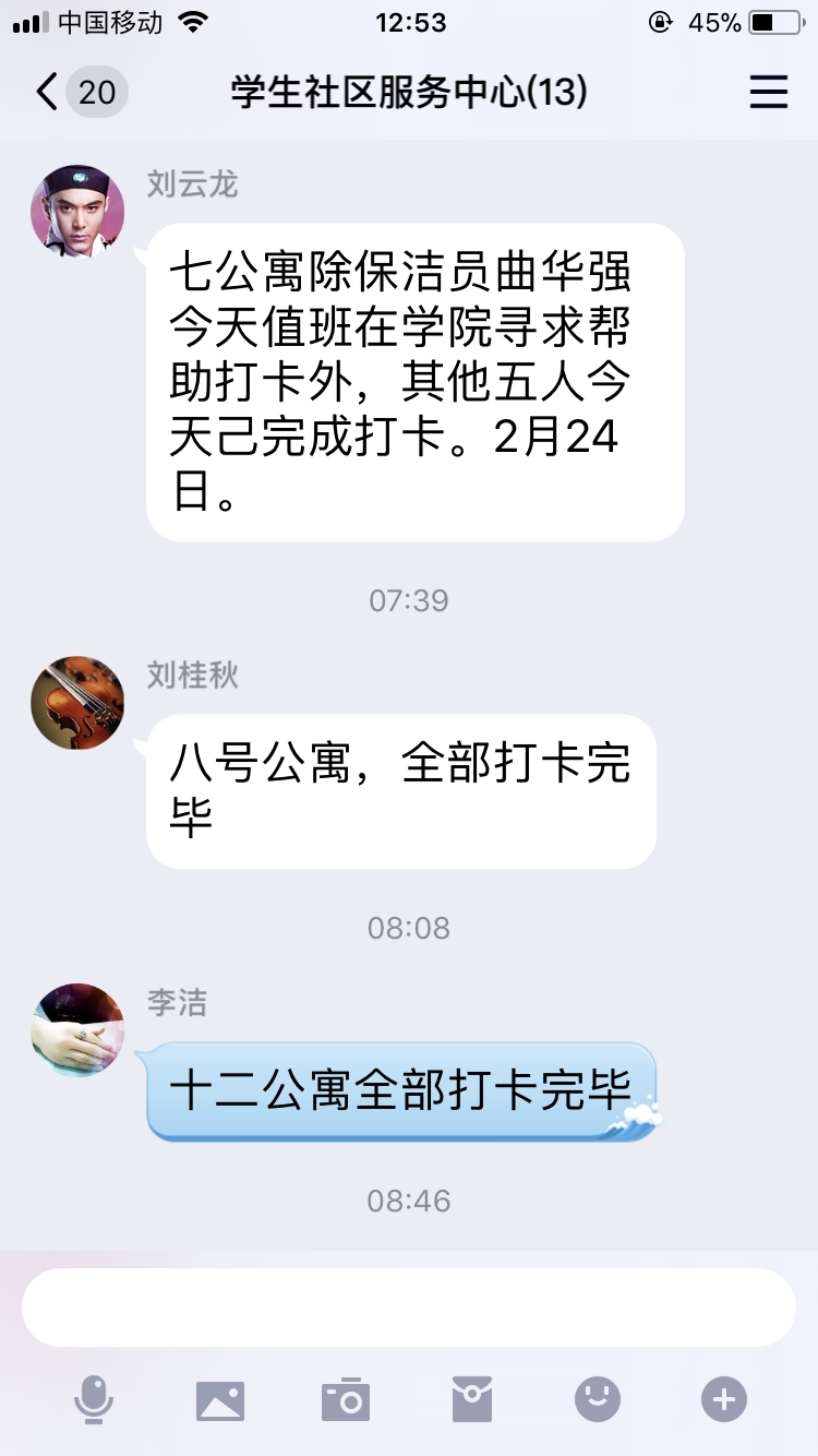 荣成学院社区服务中心共59人,其中管理人员13人,楼管、保洁等服务人员46人,其中50岁以上43人,无智能手机7人。接到学校《关于启用学校疫情防控信息管理平台的通知》的任务后,考虑到职工老龄人员的比例及智能手机、软件操作能力等现状,社区服务中心立即设计安排工作方案,建立“社区服务中心—楼长—服务人员”的三级网格管理模式,将各公寓楼长设为网格员,采用电话教授、同村同事帮助指导、返校现场学习等方式,通过“一对一”、“点对点”的策略,对所有人员进行了平台使用培训。针对部分难以顺利使用平台的人群,重点进行了身体健康状况和行动轨迹的摸排,并在保证每日真实、及时上报个人情况的前提下,采取了“子女代操作”和“网格员代操作”的方式,确保在2月24日上午10点前完成了全员疫情防控信息网络上报任务。