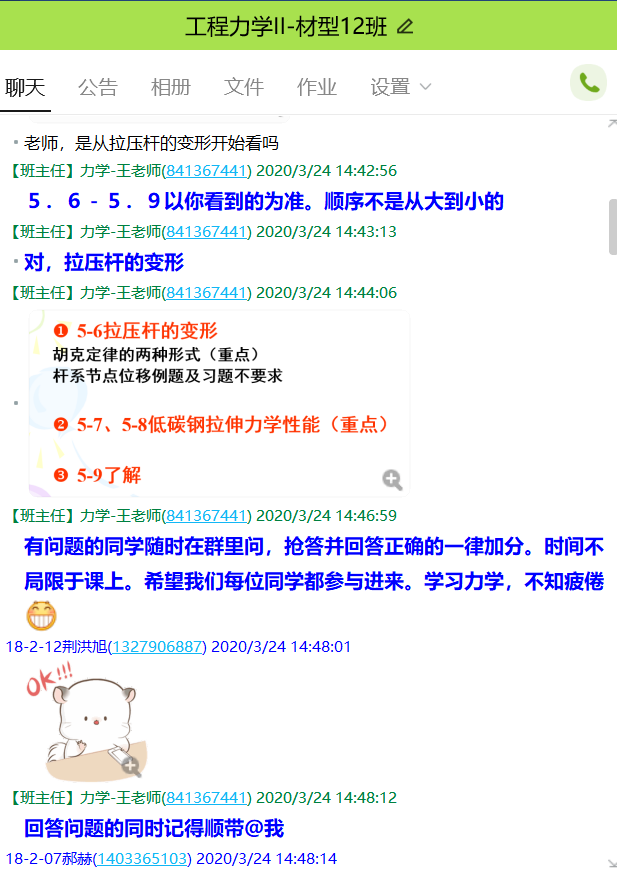 自在线授课以来,王雪老师的工程力学课程在充分利用中国大学MOOC平台异步SPOC教学资源的基础上,合理利用慕课堂签到、腾讯课堂直播、QQ群答疑解惑、平台作业互评、课堂笔记展评等方式积极调动每一位学生的学习热情,号召组建班级内部“力学不倦”学习小组,形成小组成员“帮扶带”学习模式,确保所有成员在网络教学环境中不迷路、不掉队。