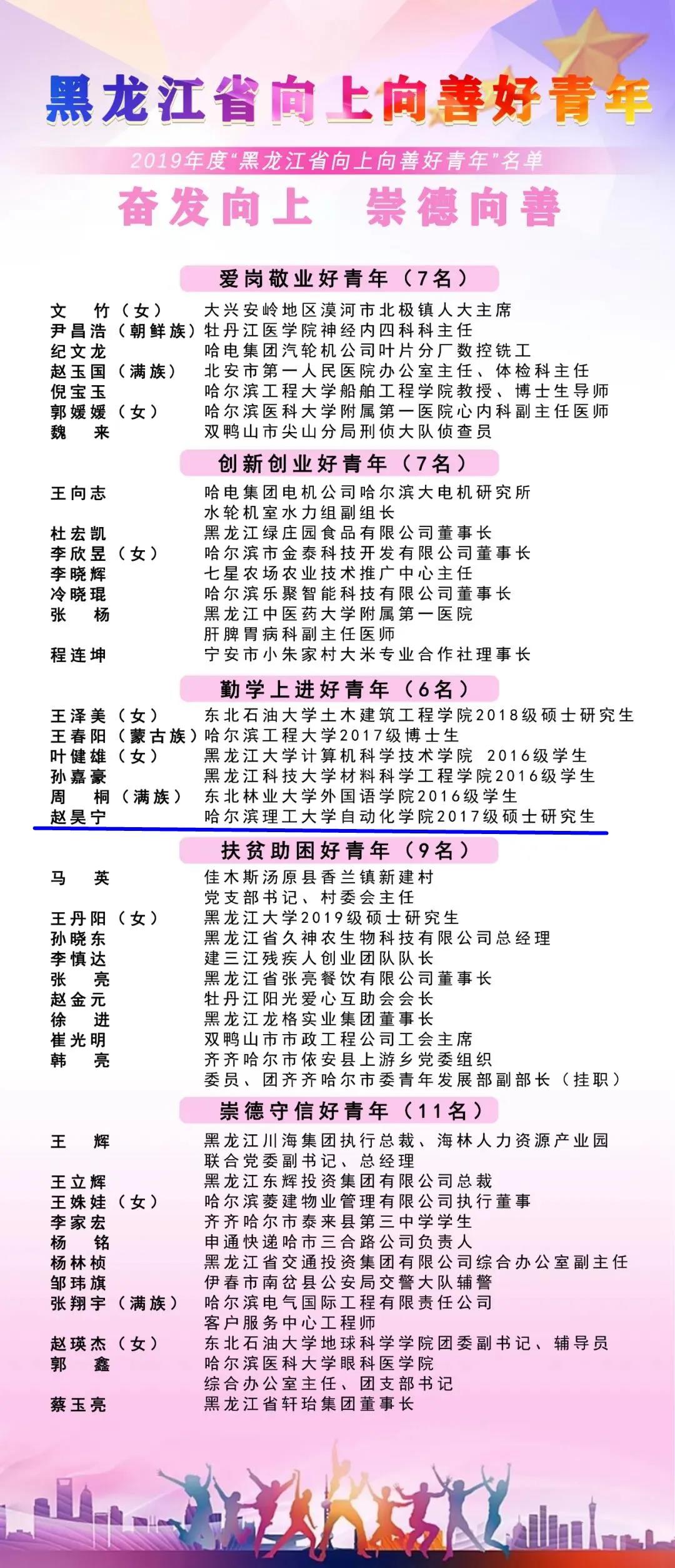在五四青年节来临之际,2019年度“黑龙江省向上向善好青年”名单揭晓。全省40名优秀青年获此荣誉。 当选人员涵盖医务工作者、科技工作者、创业者、教师、产业工人、公安干警、志愿者、大中学生等职业和领域,具有广泛的代表性,其中包括在新冠肺炎疫情防控工作中涌现出的优秀青年典型。哈尔滨理工大学自动化学院研究生赵昊宁同学荣获黑龙江省2019年度“勤学上进好青年”荣誉称号!