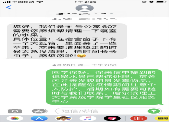 开启“接单”模式,为学生提供暖心的“云服务”。4月16日起,学生社区服务中心开启疫情期间“接单”模式,为学生提供暖心的“云服务”。学生如有检查被褥是否发霉、清理寝室遗留垃圾、花草浇水等需求,可通过电话、短信、微信公众平台“下单”,学生社区服务中心依次“接单”处理并及时回复。