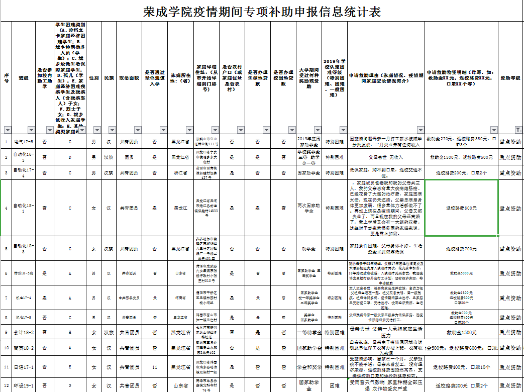 荣成学院疫情期间专项补助申报信息统计表