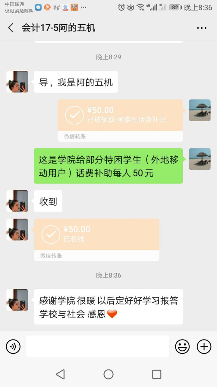 辅导员为家庭经济困难学生转账话费补助截图