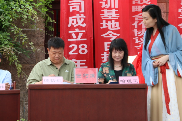 仪式最后徐向晨院长与李洪霞部长为哈理工荣成学院实习实训基地揭牌,张桂华副院长代表荣成学院与德信红进行现场签约。