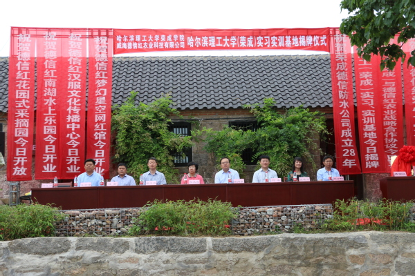 6月18日上午9时,哈理工荣成学院实习实训基地揭牌仪式、哈理工荣成学院与威海德信红农业科技有限公司合作签约仪式暨德信红景区开业剪彩仪式在宁津街道留村举行。荣成市委常委、宣传部长李洪霞,校党委常委、工会主席兼荣成学院院长徐向晨,荣成市人大常委会副主任徐志兵,荣成市人民政府副市长刘峰,荣成学院常务副院长杜野,副院长张桂华,石岛管理区党工委副书记王云峰,荣成市文化和旅游局局长刘少伟,威海德信红农业科技有限公司董事长闫红强出席了仪式,仪式由宁津街道办事处主任林永波主持。
