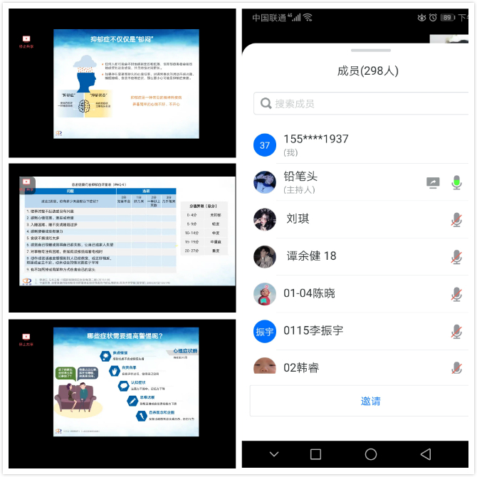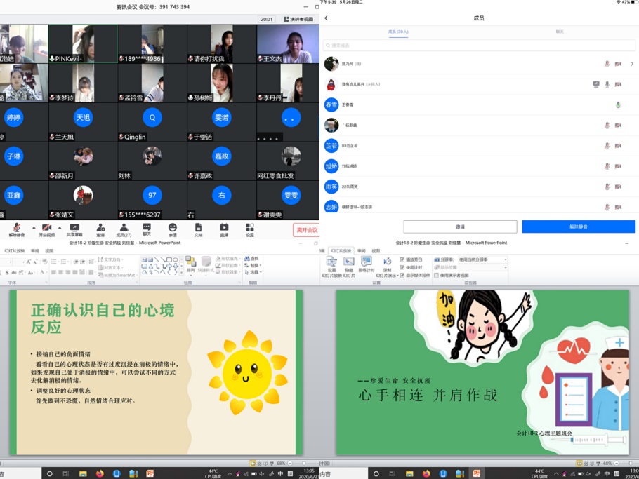 为了缓解疫情给学生带来的心理负面影响,5月15日-6月15日,18、19级心理委员通过腾讯会议等线上方式,在班级内部开展了主题班会活动。班会中,同学们分享了疫情带来的心理困扰,讲述疫情期间身边的人与事,谈论对本次疫情的认识和应对措施,共同探讨疫情期间自我提升、自我约束的有效方法。